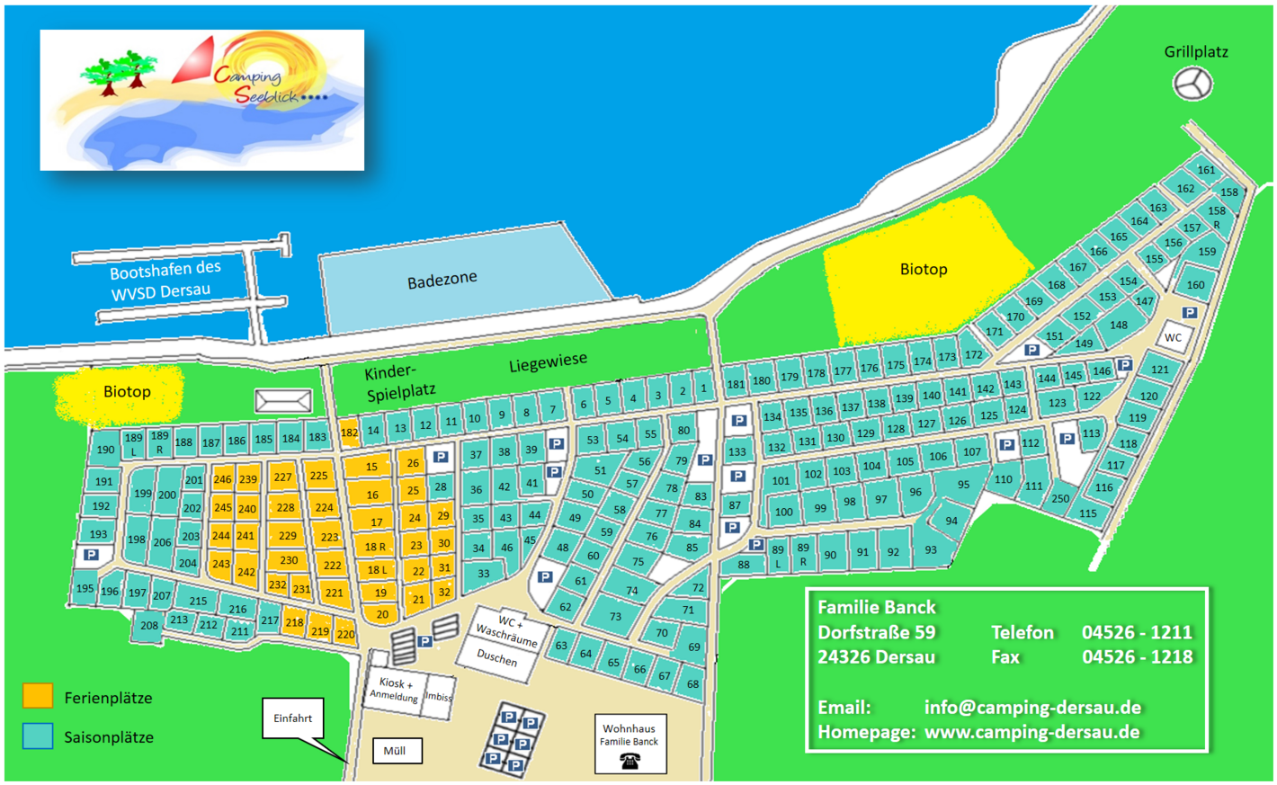 Dieser Platzplan gibt Ihnen eine Übersicht aller Stellplätze auf unserem Campingplatz. Bei den gelb eingefärbten Stellplätzen handelt es sich um Ferienstellplätze, für Zelte, Wohnmobile oder Caravans. Die blauen Plätze sind Saisonplätze.